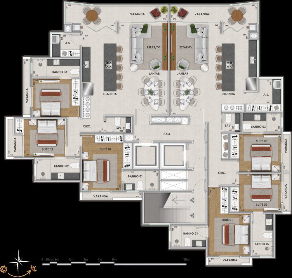 OBS: Todas as imagens e perspectivas aqui contidas são meramente ilustrativas. As tonalidades das cores, formas e texturas podem sofrer alterações. Os acabamentos serão entregues conforme memorial descritivo do empreendimento. Os mesmos são sugestões de decoração com dimensões comerciais e não fazem parte do contrato de aquisição da unidade. O memorial descritivo anexo ao instrumento particular de compra e venda sempre prevalecerá em caso de divergências. A vegetação exposta é meramente ilustrativa. Este material é preliminar e está sujeito a alteração sem aviso prévio.
